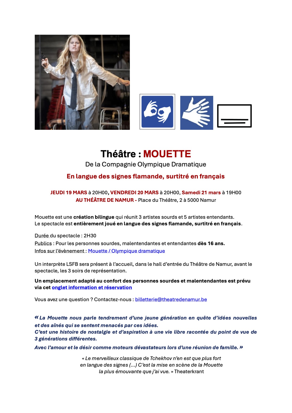 Le spectacle est entièrement joué en langue des signes flamande, surtitré en français.